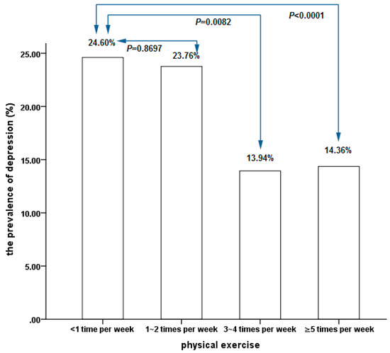 Figure 1 shows the comparison of the prevalence of depression that was associated with four different frequencies of physical exercise. Compared with participants with a frequency of physical exercise that was less than 1 time per week there was a significantly lower prevalence of depression in participants with frequencies of physical exercise that were 3–4 times per week or ≥5 times per week. Whereas the difference in the prevalence of depression was not statistically significant between the participants with a frequency of physical exercise that was less than 1 time per week group and 1–2 times per week.