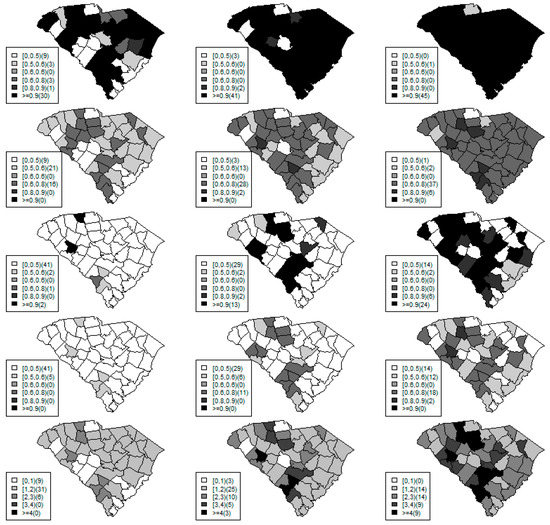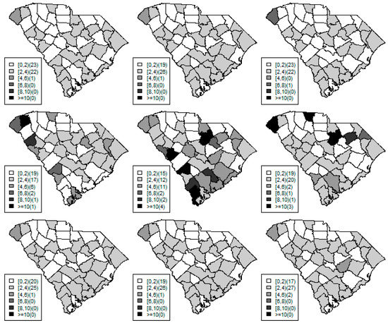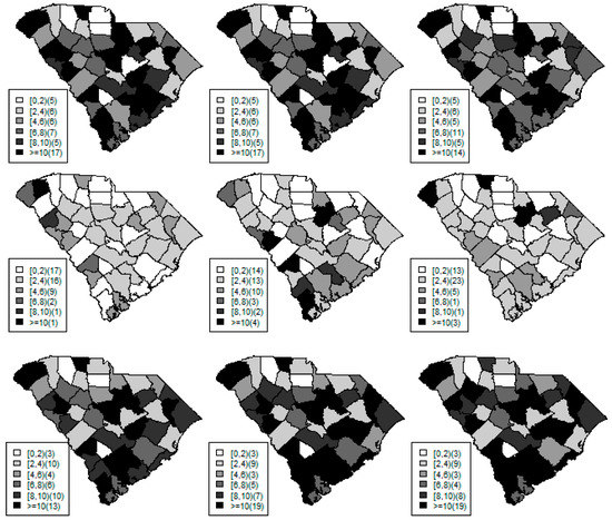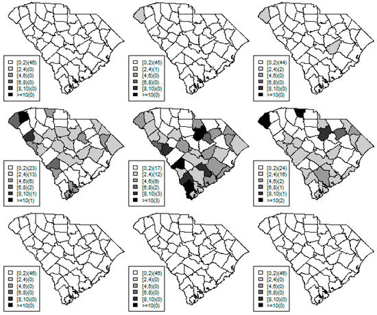 The map used in this simulation study was the state of South Carolina (SC), USA, which has 46 counties and the time periods were assumed to be yearly over a 5-year period. The expected counts were calculated from real data, the total number of emergency room discharges (ERD) for respiratory conditions, both infectious and non-infectious diseases, in SC in 2009 and assumed to be constant over the time periods. Note that we would like the simulation study to reflect some features from a real situation in which the expected rates are obtained, and calculation details of the expected rate will be provided later in the case study. Let the observed incidence for county i and year t be a Poisson random variable as . The relative risk is set to link with the logarithm function as . The errors were generated from a t-distribution with zero center and variance with the degree of freedom as in Equation (4), i.e., . The pseudocode is provided in the Supplementary Material S4 for details of the simulated data. The expected number (please see more calculation details in the case study) can be seen as the offset in Poisson models. To estimate the rates, a standard practice is to adopt the concept of indirect standardization (same as in epidemiology) which is the most common form of adjustment for population in each location in which the disease outcomes are compared. The number of expected rate in each location can generally be calculated as the average disease rate for the whole study region multiplied by the population at risk at each location. For further information about calculation of standardized rate, please refer more to, for example, [25,26].
