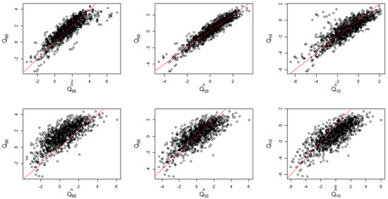 Scatterplots of simulated and estimated from quantile (upper) versus mean (lower) regression models at 10th (left), 50th (middle), and 90th (right) quantiles on the log scale. The red line represents the equality of the predicted and true quantiles.
