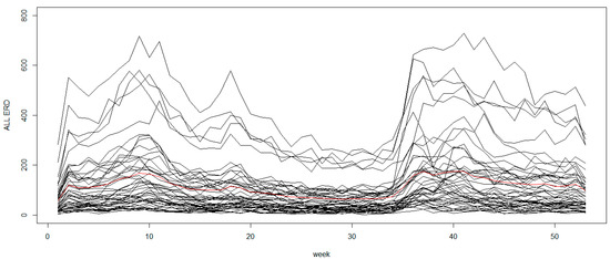 Weekly emergency room discharges of respiratory diseases in South Carolina 2009. The red line represents the mean number of cases averaged over all counties.