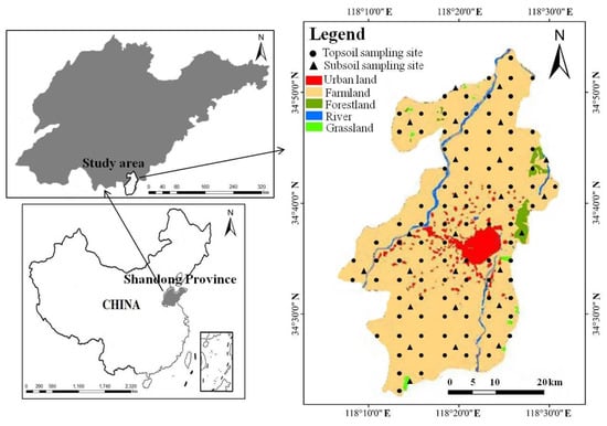 Based on grid cells, a total of 122 soil samples including 97 topsoil and 25 subsoil samples were collected from the regional farmlands in April 2017. The topsoil samples were collected from 0–20 cm in depth, with a density of 25 km2. At each sampling site, four to six subsamples near the cell center were taken and fully mixed to obtain a composite sample. The subsoil samples were collected at between 100 and 150 cm depth with a density of approximately 100 km2, which represent the natural background levels of the surrounding four topsoil samples. Geographic coordinates of all the sampling sites were recorded by a global position system (60CSX, Garmin, Olathe, KS, USA) (Figure 1).