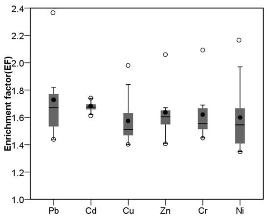 Enrichment factors of trace metals in the topsoil. Box plot (dark grey) extends from the 25th to 75th percentiles, covering the median (line) and the mean (black point) values; Circles at the top and bottom of box plot represent the maximum and minimum values; Whiskers represent the 5th and 95th percentiles.
