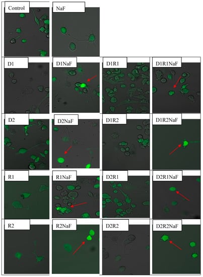 Cells were treated with rivastigmine and donepezil or with both medicaments. Final concentration of donepezil was 20 ng/mL (D1) or 100ng/mL (D2) per single well. Concentration of rivastigmine in an incubation well was concentration of 5 ng/mL (R1) ml or 25 ng/mL (R2). Concentration of sodium fluoride was 3 μM in a single well. Culture of macrophages together with NaF and DMSO served as the control. Exposition of macrophages to medicaments (D, R or DR) lasted 48 h. The intracellular generation of ROS was visualized by fluorescent indicator 2′,7′-dichlorofluorescein diacetate (DCFH-DA). Cells were filled with DCFH-DA used at the concentration of 5 μM. Following 15 min lasting exposure, macrophages were rinsed with use of medium at ambient temperature. Confocal microscope was used to analyze the obtained microscopic preparations. DCFH-DA dependent fluorescence (excitation at 495 nm, emission at 525 nm) appears as the result of its intracellular oxidation by H2O2, the red arrow indicates increased ROS level vs control group. (color should be used in print)