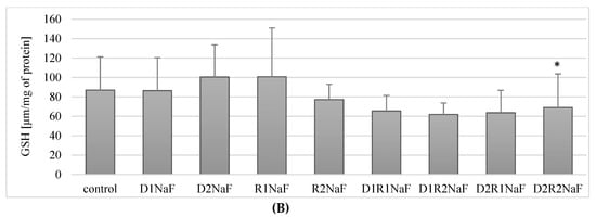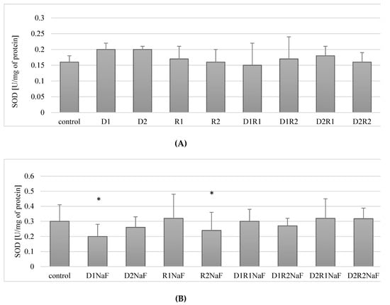It was shown that incubation of fluoride-exposed cells with donepezil at 20 ng/mL (D1) resulted in a statistically significant reduction in SOD activity compared to control of about 30% (p = 0.05) (Figure 2B). Cultivation of cells with donepezil (100 ng/mL; D2) did not influence SOD activity when compared to control (p = 0.07) (Figure 2B).