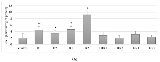 In cells incubated with donepezil, a statistically significant increase in CAT activity was observed compared to the control for both concentrations used (respectively: for 20 ng/mL (D1) by about 188% (p = 0.04), for 100 ng/mL (D2) by ca. 70% (p = 0.04)). Similar relationships were observed for rivastigmine: at 5 ng/mL (R1) an increase of about 136% (p = 0.04) and at 25 ng/mL (R2) by 367% (p = 0.04) compared to the control (Figure 3A).