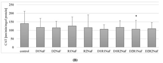 In summary, in fluoride-exposed macrophages there was a statistically significant lower CAT activity compared to controls, when incubated with donepezil at 100 ng/mL together with rivastigmine at 5 ng/mL. In other cell cultures, i.e. those incubated with: D1, D2, D1R1, D1R2, D2R2, there was no statistically significant effect of the drugs on CAT activity in fluoride-exposed macrophages (Figure 3A,B).