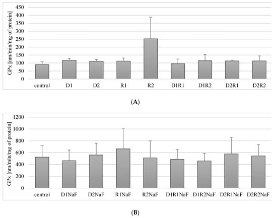The combined use of both drugs: donepezil and rivastigmine in the studied systems (D1R1, D1R2, D2R1, D2R2) did not significantly influence the change in GPx activity as compared to the control (respectively: p = 0.25, p = 0.12, p = 0.6, p = 0.25) (Figure 4B).