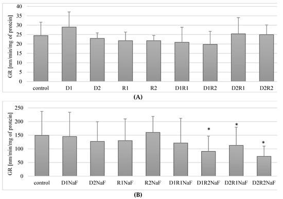 Influence of acetylcholinesterase inhibitors on glutathione reductase (GR) activity in THP-1 macrophages (A) and fluoride-exposed THP-1 macrophages (B).