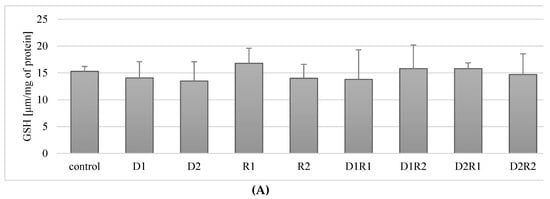 A Glutathione Assay Kit (Cayman Chemical, Ann Arbor, MI, USA) was performed to determine the concentration of the reduced form of glutathione. The determination was made by spectrophotometric method according to the procedure provided by the supplier.