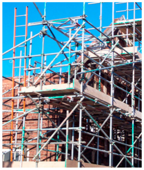 - British Standards Institute. BS 5973: 1993: Code of Practice for Access and Working Scaffolds and Special Scaffolds in Steel; British Standards Institute: London, UK, 1993. [Google Scholar]
