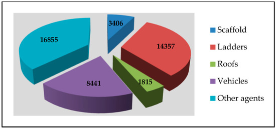 A report entitled “Statistics of Workplace Fatalities and Injuries. Falls from Height” focused exclusively on falls from height in the UK. Analyzing the data provided in this report, it is possible to determine the precise position of scaffolding in relationship with other material agents. This report presented data for the period 1996/1997 to 2007/2008, particularizing for different material agents and differentiating between fatal and major accidents, and between accidents due to low falls, high falls, and due to falls from height by agent breakdown. Analyzing cumulative total accidents for the period 2002 to 2008, and considering only fatal and major accidents, scaffolding is placed in fourth position behind ladders, vehicles, and plant and earth moving equipment, and ahead of roofs (see Figure 6). Differentiating between fatalities and major accidents, scaffolding places third in the case of fatal accidents, after ladders and roofs, and third in the case of serious accidents, but after ladders and vehicles. Using the same analysis but differentiating between high falls, low falls, and falls due to agent breakdown, again for all types of falls, scaffolding is above roofs and below ladders, vehicles, and plant and earth moving equipment, except in the case of high falls, where scaffolding comes higher than vehicles and plant and earth moving equipment [30].