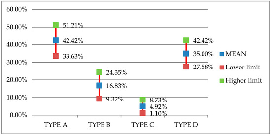 The safety level ranking of the different types of scaffolding under analysis is based on values of 1, being the safest, to 4, the least safe. Analysis of the experts’ evaluations is reflected in the results shown in Table 3 below, showing the mean values for the estimated levels of safety and the corresponding 95% confidence intervals. Thus, scaffolding system Type A is identified with a mean value of 1.25 as the safest, followed by Type B (mean value 1.67) and Type C (2.71), with Type D (mean value 3.33) being identified as the least safe. These results are consistent with those obtained by Reference [8] only in relation to scaffolding types A, B, and C, since Type D was not included.