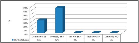 The experts agreed that enacting a specific EU product safety directive for scaffolding would be positive, with 67% indicating that it would probably be positive, and 33% indicating that it would definitely be positive (Figure 8). This result is in line with other studies that justify the need to implement other product safety directives—for example, for the design and manufacture of machinery that may pose a risk to workers [8,33,44]. However, the complexity of enacting this directive is recognized in view of the fact that the implementation of a product safety directive implies finding a delicate balance between the market and safety requirements [45].