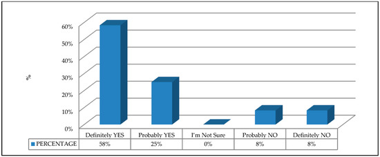 Some 84% answered “Probably yes” or “Definitely yes”, as can be seen in Figure 9. According to the results obtained and to other research [46], the need for this specific training and qualification of scaffolding assemblers is clear, to improve safety conditions during the assembly, use, and dismantling of scaffolding, and to ensure the proper supervision, control, and maintenance of scaffolding [44,45,46,47]. Logically, the need to establish this type of specific training is even greater in the case of nonstandardized scaffolding, while its use remains permitted.