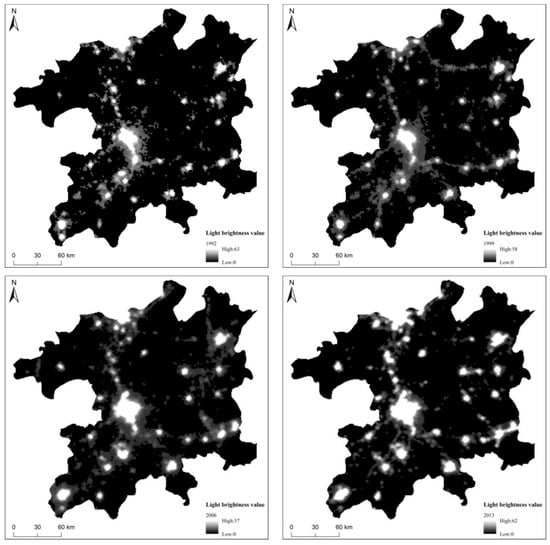 Poyang Lake Ecological Economic Zone nighttime light data from 1992, 1999, 2006, and 2013.