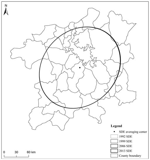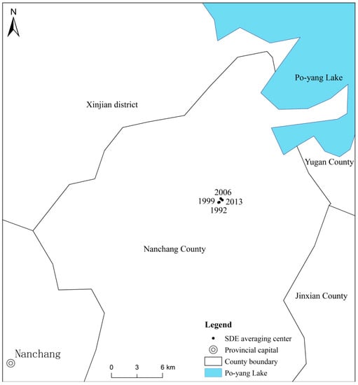 Figure 3 and Figure 4 show that the long axis and short axis of the standard deviation ellipse of the Poyang Lake Ecological Economic Zone change little over the inspection period. The general form is an elliptical shape, and the spatial distribution generally shows a “southwest-northeast” orientation. The standard deviation of the urban system scale is slightly stronger than the short axis or the long axis of the ellipse. This indicates that urban growth in the east-west direction is slightly stronger than in the north-south direction. This is because the urban distribution of the Poyang Lake Ecological Economic Zone is mainly concentrated in the east and the west. For example, Nanchang City, the core city of the Poyang Lake Ecological Economic Zone, is located in the western part of the region. Therefore, the urban growth in the east-west direction is stronger than the north-south direction. From 1999–2013, the variation of the ellipses was larger than the variation of the standard deviation ellipse from 1992–1999. It is apparent that after the 21st Century, the economic expansion of the Poyang Lake Ecological Economic Zone increased significantly. In addition, this also reflects that the implementation of the “Poyang Lake Ecological Economic Zone Plan” has, indeed, accelerated the development of the Poyang Lake Ecological Economic Zone.