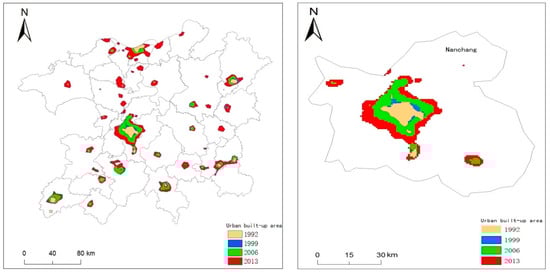 Comparison of the urban built-up area between the Poyang Lake Ecological Economic Zone and Nanchang City in 1992, 1999, 2006 and 2013.