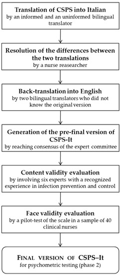 Translation and cross-cultural adaptation of the CSPS followed the guidelines for the cross-cultural adaptation and translation of self-reported instruments [28]. A scheme of the entire process is reported in Figure 1. Initial translation in Italian was conducted by two independent bilingual translators with Italian as their primary language (an infection control expert nurse working in a university hospital and a professional translator without knowledge of SPs). Both translators were able to detect ambiguous items (e.g., item 13) and provided a written report of the translation process. Any difference between the two translations was resolved by a third nurse researcher. The Italian version of the CSPS was then independently back-translated into English by two different bilingual translators, with English as their primary language. They were masked to the original English version of the questionnaire. A group of experts (the project leader, who was a nurse researcher, a methodology expert, the involved professional translators, a doctor specialized in infectious diseases and public health and an infection control nurse) developed the pre-final version of the questionnaire for field testing. All experts had a good fluency in both English and Italian languages. The experts reviewed all the translations and reached a consensus on any discrepancy achieving semantic, idiomatic, experiential, and conceptual equivalence between the original version of the CSPS and the Italian version.