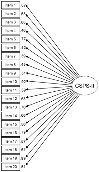 In order to assess construct validity, a unidimensional model was tested in line with the practice to compute an overall score [24,25,26,38]. This model yielded acceptable fit indices: χ2 = 508.26 (p < 0.001), CFI = 0.90, TLI = 0.87, RMSEA = 0.09 (CI 90% = 0.08–0.10), and WRMR = 1.596. Thus, the CSPS-It was considered unidimensional (Figure 2). All the factor loadings were significant (p < 0.001) and were ≥ 0.39. In particular, the factor loadings of several items were > 0.75 (items 1, 5, 10, 13, 16, 19).