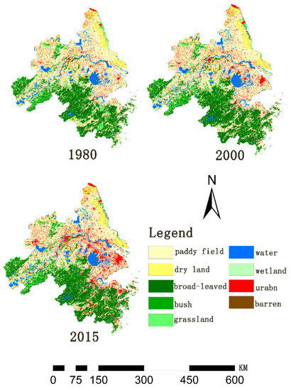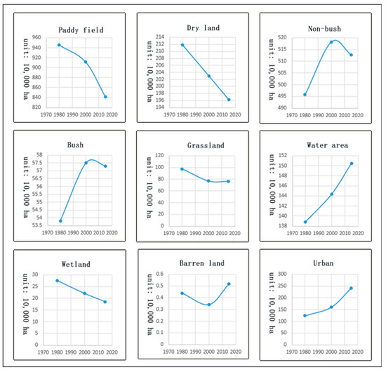 During the study period, land use/land cover underwent major changes (Figure 3). From 1980 to 2015, farmland (paddy field and dry land), grassland, and wetland were gradually decreasing; the trend of decreasing paddy field area gradually increased and the trend of decreasing grassland area gradually weakened. The area of water and towns gradually increased, and both bush and non-bush forests first increased and then decreased. From 1980 to 2000, the area of bush and non-bush forests increased greatly, while wasteland first decreased and then increased.