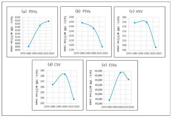 Time-varying trends of ESVs in the Yangtze River Delta urban agglomeration. (a) Regulating services values (RSVs); (b) provisioning services values (PSVs); (c) habitat services value (HSV); (d) cultural and amenity services value (CSV); and (e) total ecosystem services values (ESVs).