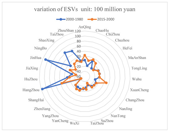 According to the radar chart, the regional variation in the ESVs is significant (Figure 5). From 1980 to 2000, the largest values’ variation of ecosystem services was in Jinhua City, Hangzhou City, Ningbo City, and Taizhou City, and it was also positive. The ESVs of Huzhou City, Chizhou City, Anqing City, and Zhoushan City increased slightly, and other cities experienced a decrease. From 2000 to 2015, the values’ variation in ecosystem services was the largest in Hangzhou, Xuancheng, and Anqing. The values’ variation of ecosystem services was positive due to a small increase in ESVs in Taizhou, Zhoushan, Shaoxing, Jinhua, Huzhou, Zhangzhou, Chizhou, and Chaohu, while the ESVs in the other cities decreased. There were 14 cities with reduced ecosystem services during the two study periods: Shanghai, Zhenjiang, Yangzhou, Yancheng, Wuxi, Taizhou, Suzhou, Nanjing, Nantong, Changzhou, Wuhu, Tongling, Maanshan, and Hefei. Among them, Shanghai had the largest reduction, and its ESVs continue to decrease.