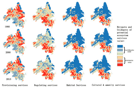 The Getis–Ord statistic [64] is one of the Local Indicators of Spatial Association (LISA) measures [65]. Calculating Getis–Ord statistics can identify hot spots and cold spots of the potential supply of each ecosystem service. Cold/hot spots are areas with spatial clustering features and high/low ecosystem service supply values [62]. The cold/hot spots analysis results enable spatial and visual comparisons among ecosystem services [66]. The cold/hot spots analysis tool of ArcGIS was used to calculate the spatial distribution of the high and low clusters of ESVs of the four different ecological service types (Figure 6). Higher Z-scores indicate a higher intensity of ESVs clustering. Lower Z-scores indicate a lower intensity of ESVs clustering.