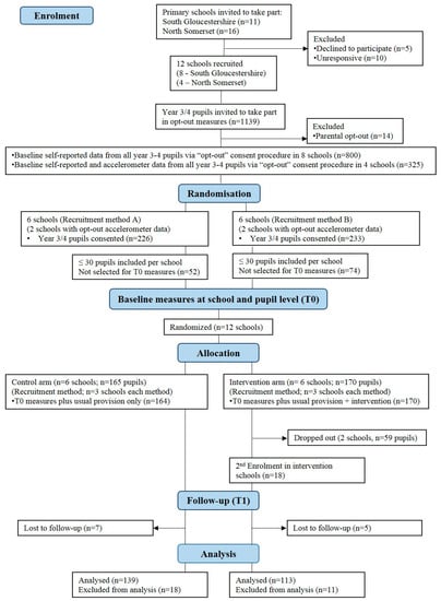 Twelve state-funded primary schools from South Gloucestershire (n = 8 schools) and North Somerset (n = 4 schools) in Southwest England were recruited to the study. The target population for this study were pupils in Year 4 and 5 (aged 8 to 10 years) at the time of the intervention. We aimed to recruit up to 30 children per school.