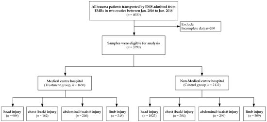 The evaluation and management of patients with trauma transported by EMS [,,] and the impact of EMS and non-EMS transport on the survival rate of patients with trauma [,,] have been extensively studied, but the impact of changes in the trauma treatment system on the treatment outcome of patients with trauma transported by EMS remains unknown. In addition, previous studies on the impact of trauma centres on treatment outcomes were limited to the urban areas in China [,]. Individual variability in different patients may be overlooked due to deficiencies in statistical methods, thereby possibly resulting in estimation bias and providing false evidence in the process of policy development and evaluation.