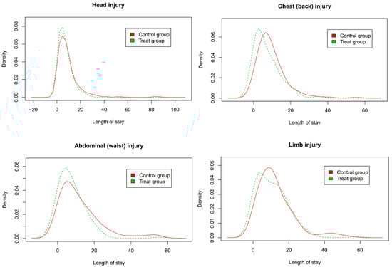 Figure 3 shows the kernel density curves of LoS for matched head injury, chest (back) injury, abdominal (waist), and limb injury patients transported by EMS in two groups. We found that the peaks of curves of four types of trauma patients transported by EMS were more towering and shifted to the left to varying degrees, and the area under the tail of the curves was reduced, indicating a reduction in LoS after policy implementation.