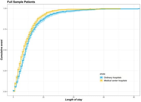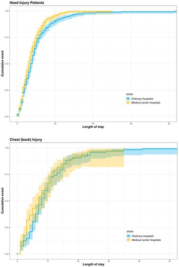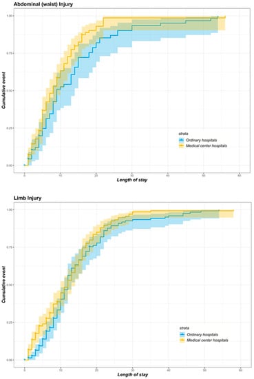Table 3 illustrates the estimates of the Cox hazard proportion model for all matched patients with head injury, chest (back) injury, abdominal (waist) injury, and limb injury. After using the Schoenfeld residuals to test the proportional hazard assumptions, four variables (admission status, inpatient care cost, surgery and the number of disease diagnoses) for all patients, two variables (inpatient care cost and the number of disease diagnoses) for those with head injury, one variable (inpatient care cost) for those with abdominal (waist) injury, and one variable (surgery) for those with limb injury did not meet the proportional hazard assumption. Therefore, interaction terms with LoS were added at each end of the columns of these variables. Higher HRs were associated with the treatment group across all patients with trauma (HR = 1.249, p < 0.001), head injury (HR = 1.416, p < 0.001), chest (back) injury (HR = 1.112, p = 0.560), abdominal (waist) injury (HR = 1.273, p = 0.016), and limb injury (HR = 1.078, p = 0.561).