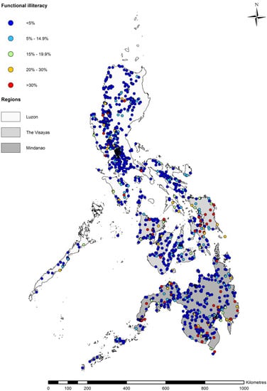 Environmental factors and poverty play important roles in the spatial variation of functional illiteracy in the Visayas and Mindanao. While our results indicate that environmental determinants play different roles in functional illiteracy depending on the region, the effects of environmental variables on the spatial variation of functional illiteracy were greatest in Mindanao.
