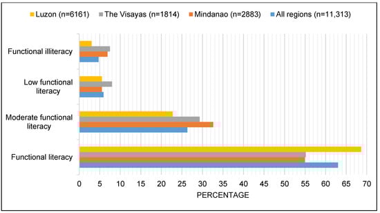 Functional literacy is one of the targets of the Sustainable Development Goals (SDGs) of the United Nations. Functional literacy indicators are likely to vary between locations given the geographical variability of its major determinants. This property poses a challenge to decisions around efficient allocation of population services and resources to mitigate the impact of functional literacy in populations most in need. Using functional literacy indicators of 11,313 school-aged children collected in 2008 during the nationwide survey, the current study examined the association between functional literacy and geographical disparities in socioeconomic status (SES), water supply, sanitation and hygiene, household education stimuli, and environmental variables in all three regions of the Philippines (Luzon, the Visayas, and Mindanao). Three nested fixed-effects multinomial regression models were built to determine associations between functional literacy and a wide array of variables. Our results showed the general prevalence rate of functional illiteracy as being 4.7%, with the highest prevalence rate in the Visayas, followed by Mindanao and Luzon (7.5%, 6.9%, and 3.0%, respectively. Our results indicated that in Luzon prevalence of functional illiteracy was explained by variation in household education stimuli scores, sources of drinking water, and type of toilet facility. In Mindanao and the Visayas prevalence of functional illiteracy was primarily explained by geographical variation in SES, and natural environmental conditions. Our study highlights region-specific determinants of functional literacy and the need for geographically targeted, integrated interventions.