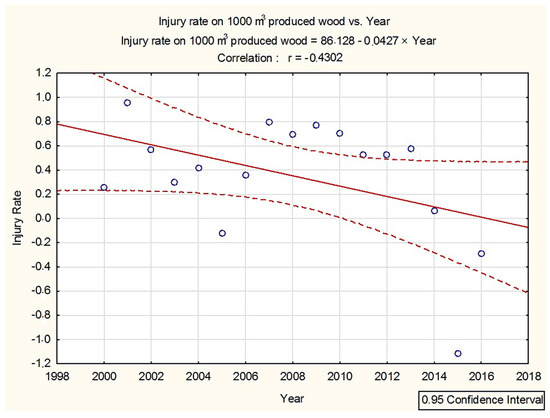 The injury rate in the forest industry over the years 2000–2016 was decreasing. The trend in the injury rate for the forest industry on 1000 m3 of produced wood in the years 2000–2016 is illustrated in the graph (Figure 2).