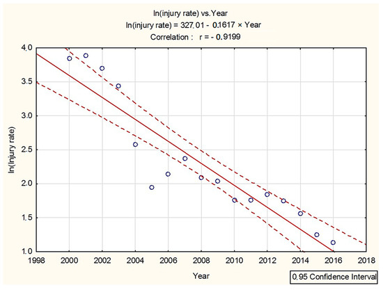Coefficients used in Model (8) were b0 = 327.0145 and b1 = −0.1617, with the standard error of s.e.(b0) = 35.7358 and s.e.(b1) = 0.0178. As is shown in the model, the injury rate decreases by 0.16 units per year after logarithmic transformation. Expected change in the number of injuries was exp (−0.1617) = 0.8510 from year to year. Therefore, the injury rate decreases approximately by 14.9% (= 100 × (1 − 0.8510)%) annually. An approximate 95% confidence interval for the parameter which is changed yearly is −0.1617 ± 1.96 (0.0178) = (−0.1264; −0.1969). Seeing that b1 = 0 is not in this interval, a significant change in the primary observed injury rate per year is expected.