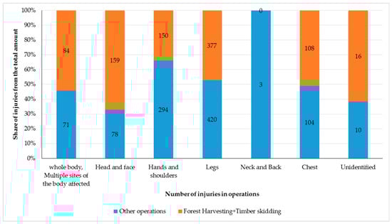 The most common parts of the body affected by workplace accidents are legs—all parts of legs (42.5% of all injuries). Leg injuries are not usually life-threatening. Head and facial injuries are those with the highest rate (67.1% injuries of these body parts) during the phase of harvesting and skidding. Moreover, these injuries can result in life-threatening damage. Injuries of the whole body or several body parts at the same time occur most often (54.2%) in the phase of harvesting and skidding. The mentioned results correspond to the high rate of fatal injuries in the phase of forest harvesting and timber skidding (3.1), as injuries to these body parts are most often life-threatening.