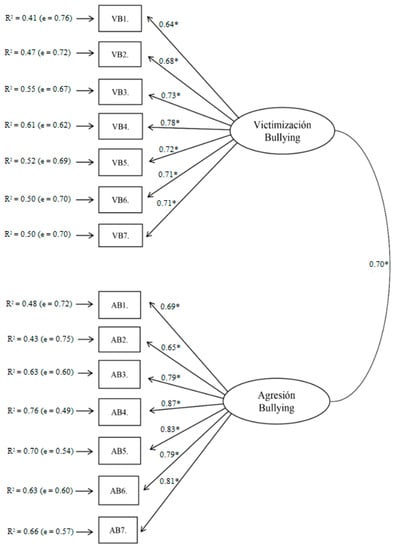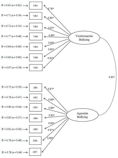 The total internal consistency and the consistency of each factor of the EBIPQ scale—victimization (VB) and aggression (AB)—were optimal (ωVB = 0.81, ωAB = 0.76, ωtotal-EBIPQ = 0.83). To perform the CFA, we initially hypothesized a one-factor structure obtaining non-fit indexes: χ2S-B = 2959.846; p < 0.01; NNFI = 0.928; CFI = 0.939; RMSEA = 0.047 (90% CI (0.045, 0.048)); SRMR = 0.098; AIC = 2805.84. Later, we tried the original structure of two-factors obtaining optimal fittings reflected in the improvement of all the indexes, especially in the RMSEA and AIC, in addition to adequate factor weights and measurement errors: χ2S-B = 1258.800; p < 0.01; NNFI = 0.950; CFI = 0.954; RMSEA = 0.041 (90% CI (0.039, 0.042)); SRMR = 0.080; AIC = 1106.800 (see Figure 1). These results show that the two-factor model is the most suitable for Ecuador.