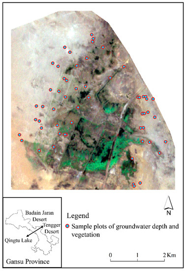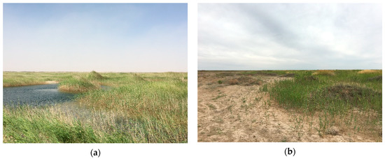We first undertook the vegetation survey. All sample plots were determined by the vegetation survey which was based on presence–absence sampling [19]. The size of each plot was 20 × 20 m. During the survey, registrations were made only in terms of whether or not the P. australis or N. tangutorum communities were present in a plot when investigated from waterside to desert edge. Registrations were mainly divided into four cases: (1) presence of P. australis and absence of N. tangutorum in a plot; (2) presence of P. australis and N. tangutorum in a plot; (3) absence of P. australis and presence of N. tangutorum in a plot; and (4) absence of P. australis and N. tangutorum in a plot. Moreover, each case was recorded only once and was not repeated for each time of survey. The information on the type of vegetation and its location was used to assist subsequent remote sensing interpretation to obtain the spatial distribution patterns of P. australis and N. tangutorum.