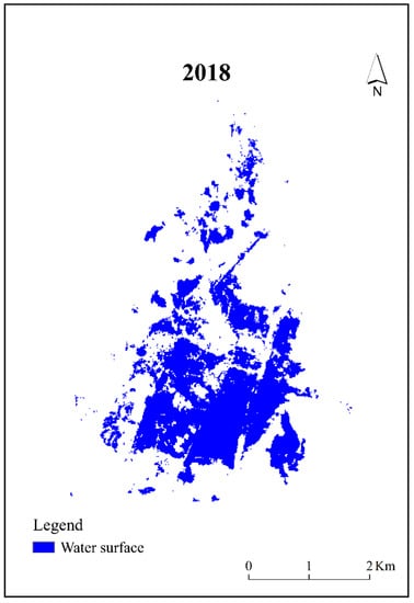 Figure 3 shows the water surface of the lake in July 2018. Since the lake dried up in 1959 and the water transport started in September 2010, the surface area in July 2010 was zero. By July 2018, the water surface area increased to about 5.68 km2. Since the water was transported into the area from the south on both sides of the east and west through artificial channels, the water surface formed in the south was more continuous, and the total area was larger than that in the north.