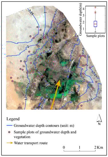 However, in this study, there are still some limitations. The first is that there may be too few sample plots for the statistical analysis to accurately obtain the most suitable groundwater depth intervals for the two kinds of plants. Second, due to the limitation of the remote sensing images resolution, there may be some deviations in the interpretation of vegetation in some local areas. Third, the results of the spatial interpolation were affected by such factors as the number of sample plots, their spatial distribution, and the interpolation methods. Due to the number and the selection of the spatial distribution of sample plots, they may be insufficient or uneven. The interpolation results of groundwater depth in some local areas may have some deviations. In addition, the factors affecting the distribution of vegetation were not considered comprehensively. This paper only considered the single factor of water. However, it did not consider other possibly related factors such as soil texture and salinity. Moreover, because of the limitation of the existing observation conditions, it was difficult to make continuous observations of vegetation and groundwater in the study area, which may mean that the statistical analysis of the results is too weak to support the conclusions regarding spatiotemporal variations. Hence, we may consider addressing these issues in future research and try to make long-term continuous observations of vegetation and groundwater variations in the study area. In the next stage, the study will focus on exploring the correlation between water transport volume and water surface area, the relationship between typical vegetation and the distribution of water and salt in the soil, and whether the soil texture also affects the formation of regional vegetation distribution.