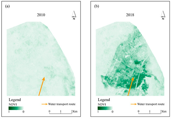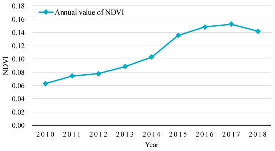 Through the calculation of the annual NDVI of the study area from 2010 to 2018, the overall regional vegetation coverage had an obvious increasing trend since water transport began (Figure 5). In 2010, before the water delivery, the mean value of NDVI was about 0.06. In the next five years, the regional vegetation coverage increased rapidly, especially from 2014 to 2015, when the NDVI increased from approximately 0.10 to 0.14. Since 2015, the growth of NDVI has slowed down to reach a maximum in 2017, which was about 0.15. In 2018, it decreased slightly to nearly 0.14. However, compared with 2010, the growth of regional vegetation coverage was still significant.