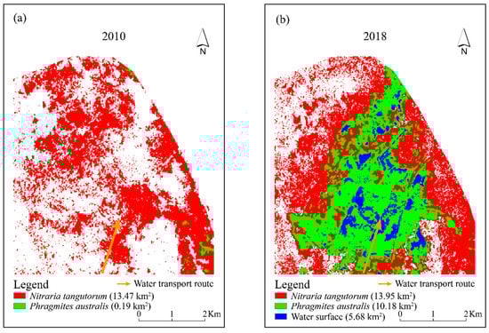 Panel (a): variation in N. tangutorum and P. australis distribution of Qingtu Lake in July 2010. Panel (b): variation in N. tangutorum, P. australis and water surface distribution of Qingtu Lake in July 2018.