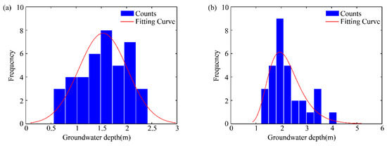 Through the attempt to analyze the correlation between the growth of the two typical vegetation types and the groundwater depth of Qingtu Lake, it was found that P. australis data and N. tangutorum data conformed to the normal distribution and the log-normal distribution, respectively. The distribution curves were fitted to the data, which are shown in Figure 9a,b and Table 1. It showed that when the groundwater depth was about 1.53 m and 1.94 m, the frequency of P. australis and N. tangutorum reached the maximum, respectively. This indicated that the groundwater depth of 1.53 m and 1.94 m may be more suitable for the growth of P. australis and N. tangutorum. Furthermore, it may be further demonstrated that the regional distribution pattern of typical vegetation was closely related to the spatial variation in the groundwater depth which was mainly affected by the water transport.