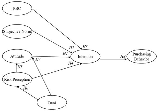 Predictors of purchasing intentions (attitude, subjective norm, PBC and risk perception) would have an indirect impact on behavior through intention.