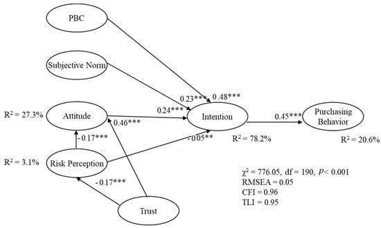 Moreover, H4 was supported by findings related to the negative impact of risk perception on purchasing (β = −0.05; p < 0.05). Risk perception predicted attitude (β = −0.17; p < 0.001). This outcome supported H5. Trust significantly (p < 0.001) predicted attitude (β = 0.46) and risk perception (β = −0.17), confirming H6 and H7. Finally, intention predicted behavior (β = 0.45; p < 0.001). Thus, H8 was accepted. Regarding the mediation analyses, PBC (β = 0.21), attitude (β = 0.11), subjective norm (β = 0.10) and risk perception (β = −0.02) indirectly (p < 0.001) influenced behavior via intention. These results supported H9. The final model explained 3.1%, 27.3%, 78.2% and 20.6% of the variance of risk perception, attitude, intentions, and behavior, respectively.