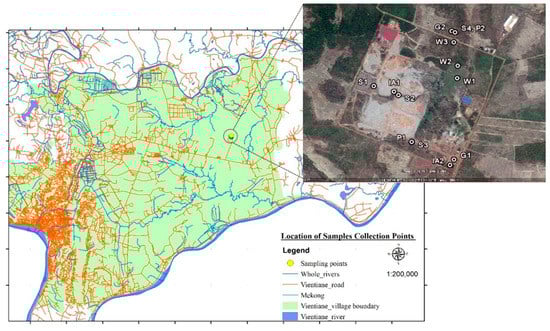 The MSW landfill in Vientiane, Laos receives around 300 tons of waste daily, of which 40–50% is organic matter. The sources of solid waste include residential, commercial, institutional, and industrial activities [23]. When hazardous waste from hospitals and industry is disposed of into the landfill, it causes groundwater and surface water pollution [24]. In the wet season, surface water runs off from the landfill [25]. Therefore, analyses for HMs should be conducted on samples collected during both the dry and wet seasons. Residents in areas close to the MSW landfill who work at the dump, such as waste pickers, may have serious health problems. However, an analysis of chemical leachates in soils, water, and plants growing in the MSW has not yet been evaluated. This research was thus conducted to assess HM concentrations in water, soil, and plants in the landfill and surrounding area to understand the pollution situation and to help establish an appropriate management strategy. In addition, this information can help develop policies for site remediation and urban environmental quality management.