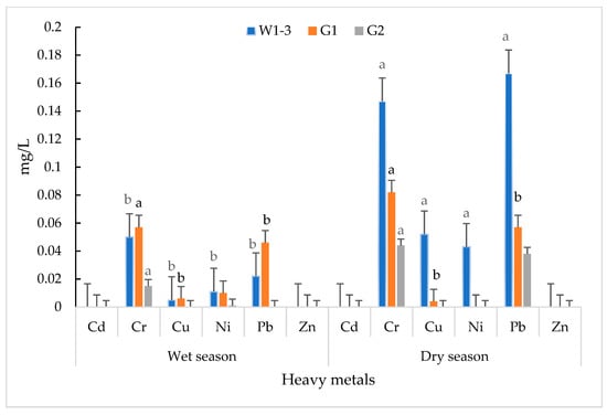 Seasonal variation of heavy metals in water. Bar values are mean ± standard error (SE); bars with similar letters are not significantly different (p < 0.05).