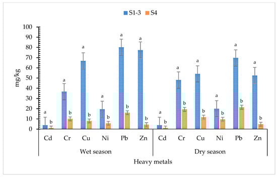 Significant difference in two locations and seasonal variation of heavy metals in soils. Bar values are mean ± SE; bars with similar letters are not significantly different (p < 0.05).
