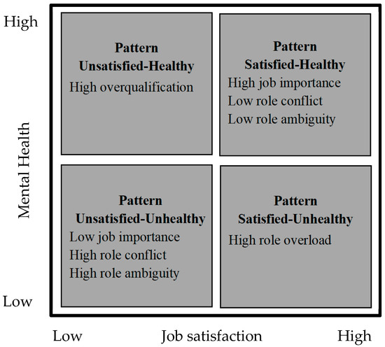 Therefore, the main aim of this study is to make a theoretical contribution to the understanding of misaligned wellbeing patterns. To accomplish this research aim, we propose two specific research objectives. The first objective involves the empirical identification of four wellbeing patterns. We argue that we can identify the four just mentioned wellbeing patterns by combining job satisfaction and mental health; they are: the satisfied-healthy pattern (both job satisfaction and mental health are optimized); the unsatisfied-unhealthy pattern (neither job satisfaction nor mental health are optimized); the satisfied-unhealthy pattern (job satisfaction is optimized, but not mental health); and the unsatisfied-healthy pattern (job satisfaction is not optimized, but mental health is). The second specific research objective involves identifying organizational and personal antecedents that characterize and differentiate each of the four patterns. Based on the model of health and wellbeing in the workplace, proposed by Danna and Griffin [4], we consider organizational stress (in terms of role stress and overqualification) and personal factors (in terms of job importance) as possible antecedents of the four wellbeing patterns. In Table A1, we list the constructs definitions and their relationship with employees’ wellbeing. In the following, we argue on the role they may have on the mis/aligned wellbeing patterns.