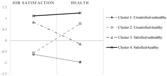 With five cases identified as outliers and six cases registered as missing from the system, the two-step cluster analysis efficiently and automatically formed four clusters. Following the recommendations of Aguinis, Gottfredson, and Joo [49] about the best practices for defining, identifying, and handling outliers, we defined them as cluster analysis outliers. We handled them by performing the rest of the analyses (e.g., discriminant) with and without them. We found that they were non-influential outliers because they did not significantly change the rest of our results. Figure 2 depicts the centroids (means) of each cluster, expressed in standardized scores of job satisfaction and mental health measures. The silhouette coefficient (which was approximately 0.5) suggested that a four-cluster solution had fair levels of cohesion and separation. We named the four clusters, considering the centroids of job satisfaction and mental health. Cluster 1 was called unsatisfied-unhealthy and comprised 33% of the sample (258 employees), showing the lowest means on job satisfaction (−0.62) and mental health (−0.97). Cluster 2 was called unsatisfied-healthy and comprised 26.6% of the sample (208 employees), showing low levels of job satisfaction standardized means (−0.56), but high levels of mental health (0.76). Cluster 3 was called satisfied-unhealthy and comprised 24.8% of the sample (194 employees), in this case showing high levels of job satisfaction (0.83), but low levels of mental health (−0.15). Finally, Cluster 4 was called satisfied-healthy and comprised only 14.3% of the sample (112 employees), showing the highest levels of both job satisfaction (1.11) and mental health (1.24). To test whether the clusters were significantly different from one another, we conducted an analysis of variance (ANOVA). The results suggested that there were significant differences in job satisfaction (F(4, 772) = 276.41, p < 0.01) and health (F(4, 772) = 477.93, p < 0.01) among the four patterns. Tukey post-hoc analyses also suggested that all the clusters were significantly different from each other. Together, these results reflect different patterns of the relations between job satisfaction and mental health.
